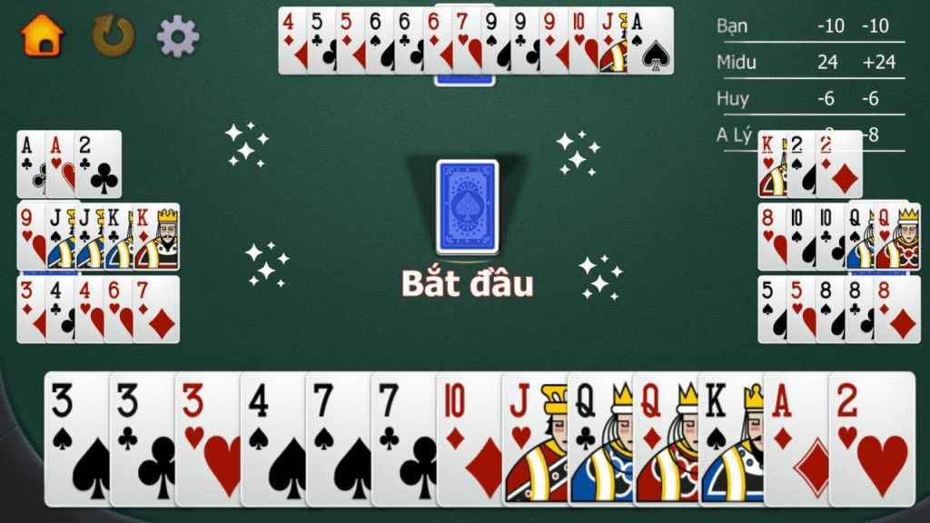 Mỗi người chơi sẽ nhận 13 lá bài. Ở ván đầu tiên, người sở hữu lá 3 bích sẽ được quyền đánh trước. Từ ván thứ hai trở đi, người thắng ván trước đó sẽ giữ quyền đánh đầu tiên.