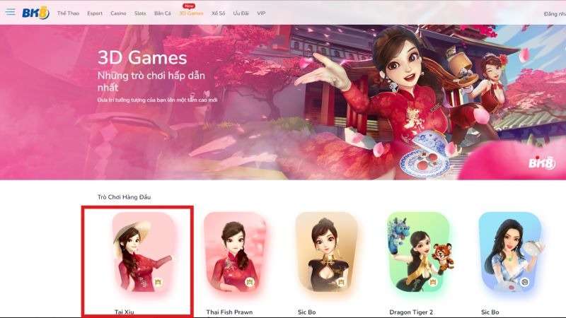 Vào mục casino hoặc trò chơi 3D, tìm đến tài xỉu 3D và chọn bàn chơi phù hợp.